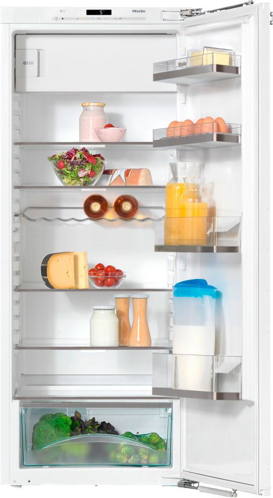 Холодильник K35442i F Встраиваемый холодильник с морозильным отделением Дверной упор правый, переставляемый Габариты (В х Ш х Г): 1395 х 559 х 544 мм Высота ниши: 1400 мм Общий объем: 241 л, зона охлаждения: 221 л, зона замораживания: 20 л Автоматика суперохлаждения/оттаивания 2 переставляемые по высоте полочки, 1 - непереставляемая, 1 бокс для овощей и фруктов Подсветка FlexiLight Гидравлический доводчик двери SoftClose ComfortClean Подставка для яиц, масленка Страна-производитель: Германия Гарания 2 года