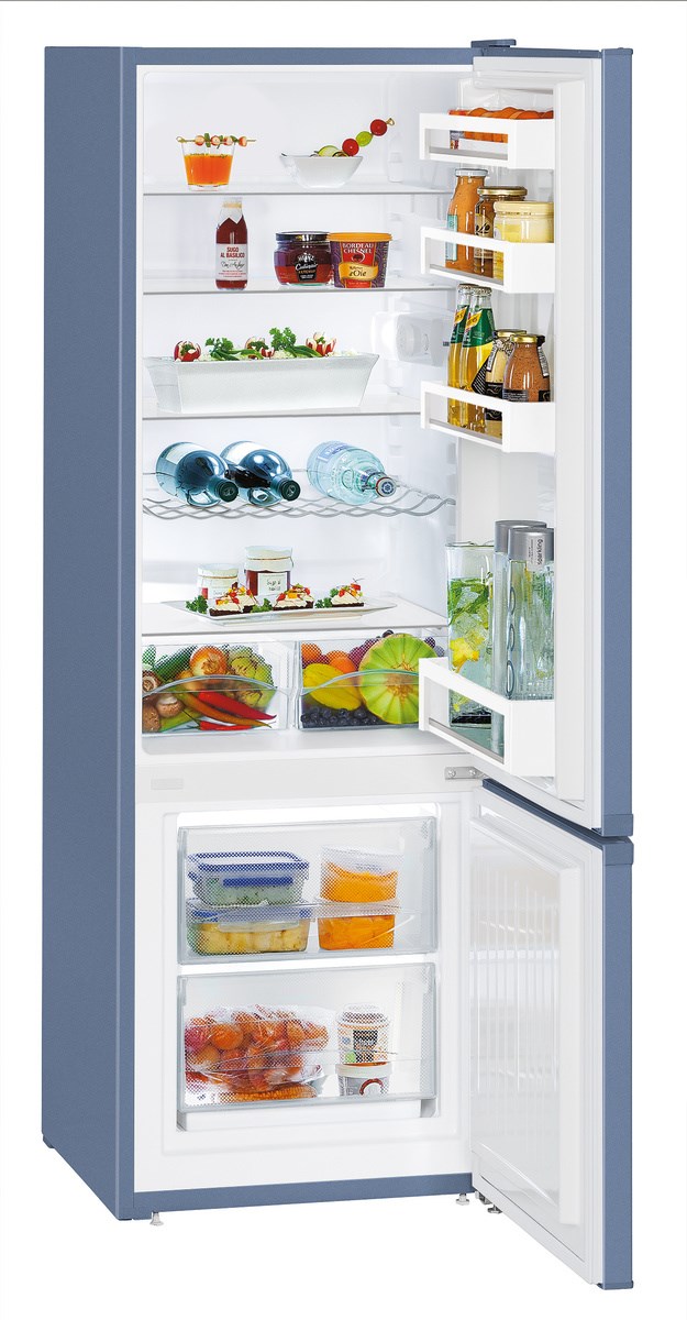 161.2x55x63, объем камер 212 и 53, морозильная камера снизу, синий