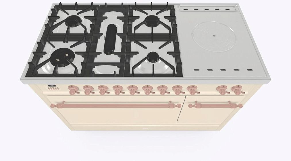 - Тип конфорок: 5 газовых, чугунная тарелка «Coupe de Feu» с кольцами